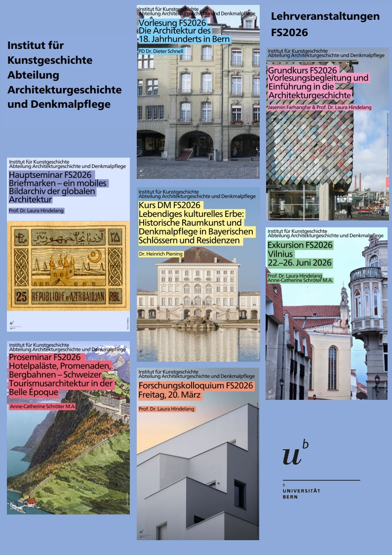 Die Abteilung Architekturgeschichte und Denkmalpflege bietet einen epochenübergreifenden Überblick der Geschichte, Theorie und Historiografie der Architektur. Architekturgeschichte als Teil der Kunstgeschichte umfasst die visuelle Kultur von Architektur und Stadt, vom baulichen Entwurf bis zur Briefmarke. Gleichzeitig beinhaltet Architekturgeschichte die Untersuchung des dreidimensionalen Bauwerks als künstlerisches Objekt und materielle Evidenz, das Aufschluss über historische Baupraktiken und soziokulturelle Nutzung gibt. Ortsbegehungen und Exkursionen sind daher wichtige Bausteine des Lehrangebots.